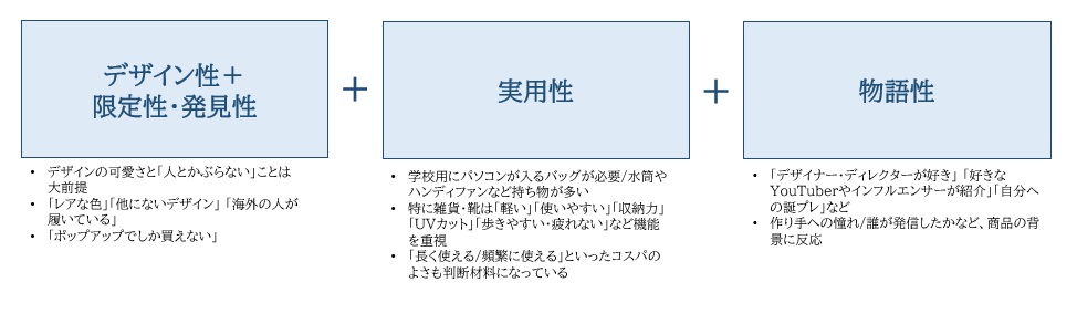 - アクセサリー、バッグチャームやリバイバルキャラクター、タンブラーなどは、「好き・かわいい」だけでなく、「これを持つ意味がある」「自分だけにわかる理由やストーリーがある」ことで愛着を感じている。